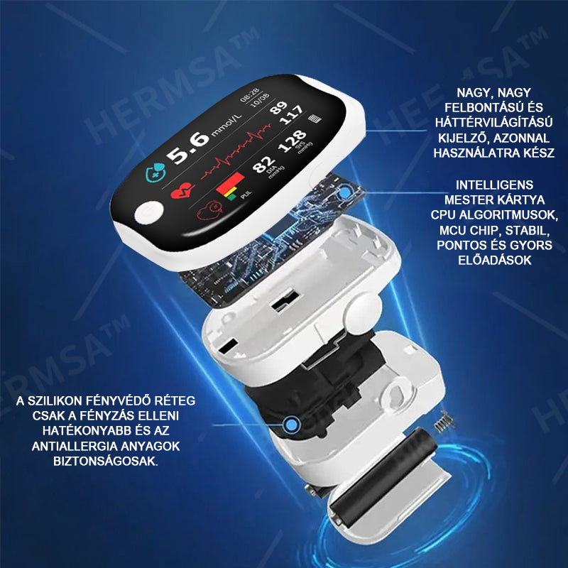 Teljesen fájdalommentes - csak helyezze mutatóujját a HERMSA-ra, és 5-8 másodpercen belül megjeleníti vércukorszintjét, oxigénszintjét és még a pulzusszámát is. Gyors és egyszerű!