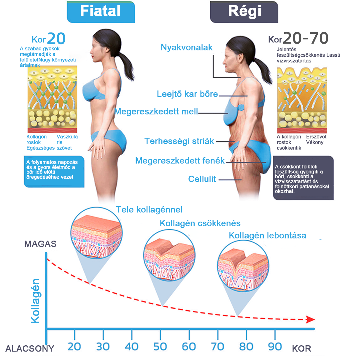 Az UV-sugárzásnak való kitettség, az oldalt alvás, a terhesség és a súlygyarapodás hozzájárulnak a bőr kollagén- és rugalmas rostjainak csökkenéséhez és károsodásához a test különböző részein. Ez olyan problémákhoz vezet, mint a megereszkedett bőr, a striák, a mellráncok és a mellpótlás. A megfelelő bőrápolás hiánya miatt az azonos korú emberek nagyon különbözően nézhetnek ki. A bőr tartós megereszkedése beavatkozás nélkül a bőr természetes feszesítő képességének tartós elvesztéséhez vezethet, ami néha sebészeti beavatkozást tesz szükségessé a normális állapot és az életminőség helyreállítása érdekében.