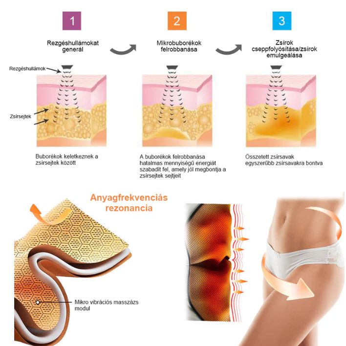 A rövidnadrágba beépített masszázsanyag mikrovibrációkat alkalmaz, alacsony frekvenciájú vibrációs technológiát használva. A test könnyű mozgásaival a vibrációk átvitelre kerülnek a vibrációt erősítő modulba, ami miatt az egész szövet meghatározott frekvenciákon rezeg, és stimulálja a konkrét izomcsoportokat. Ez a kézi masszázs hatását utánozza. A vibrációk segítenek lebontani a zsírszövetek tömörüléseit, aktiválják a mély zsírok anyagcseréjét és elősegítik a nyirok méregtelenítését.