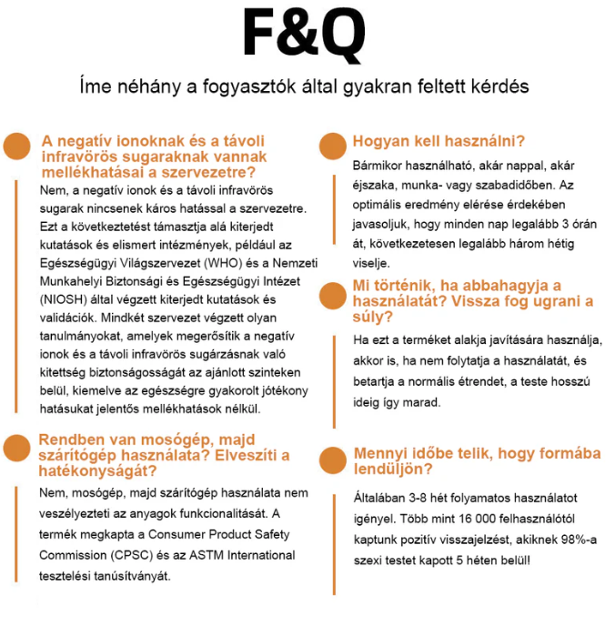 „Kezdetben azt hittem, hogy a „barackformájú fenék” csak a szűk nadrág hatása. Azonban amikor felvettem, annyira üdítő érzés volt, és a fenekem támogatása tökéletes volt. Nem arról van szó, hogy a nyomás emeli meg a fenekemet, hanem a dizájnja hihetetlenül átgondolt. Négy hét viselés után észrevettem a testemben a jelentős változásokat. Karcsúbb lettem, mint korábban, és a fenekem teltebb. Az eredmény óriási elégedettséget nyújt!”